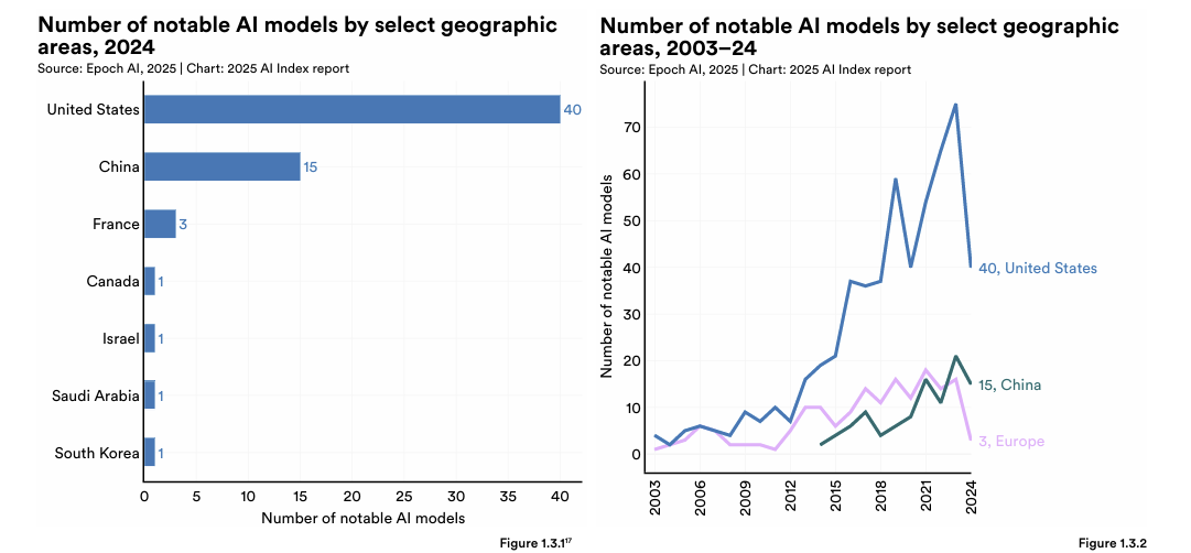 Veja o AI Index Report 2025, por exemplo. Ele apresenta uma visão clara da liderança dos EUA: US$ 252 bilhões em investimentos globais em IA, sendo US$ 109 bilhões só dos americanos, além de uma vantagem expressiva na produção de modelos, com 40 lançamentos relevantes em 2024. No papel, parece uma liderança folgada.