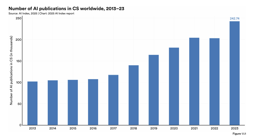 Uma leitura que me chamou bastante a atenção esta semana foi o AI Index Report 2025, publicado pelo Institute for Human-Centered Artificial Intelligence (HAI), da Universidade de Stanford. O relatório oferece uma análise profunda, baseada em dados, sobre as principais tendências globais em inteligência artificial — investimentos, avanços tecnológicos e impactos em pesquisa, indústria, políticas públicas e sociedade. Esta é a oitava edição do estudo e, embora tenha mais de 400 páginas, admito que não li palavra por palavra. Como faço com quase tudo hoje em dia, comecei pedindo um resumo para o ChatGPT para entender se valia o mergulho completo (spoiler: valia muito).